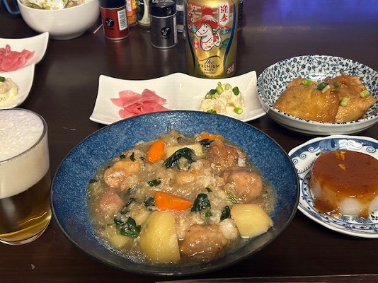 メニューはビールの横から、大戸屋風チキンかあさん煮・ふろふき大根・モチ巾着煮・数の子マヨ和え・紫大根の甘酢漬け