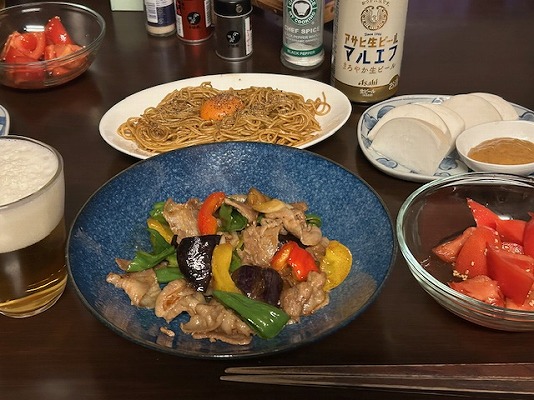 メニューはビールの横から、豚肉とナスとピーマンの中華炒め・トマトサラダ・かぶ味噌・焼きラーメン