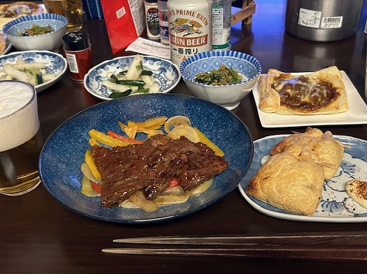 メニューはビールの横から、焼肉・納豆いなり焼き・ミートパイ・ほうれん草の胡麻和え・大根とキュウリの浅漬け