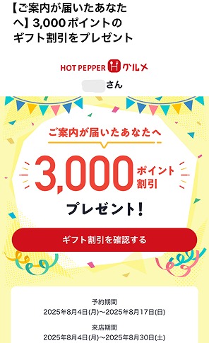 で、この3,000ポイント 前回6月にいただいた後も、何回かくれるとメールが来てたんだけど、この3,000ポイントが使えるお店って、ロクな店が無く使わなかったことが何回かありました!