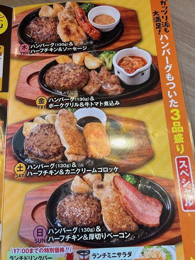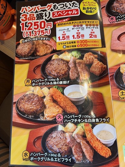 月曜日は、ハンバーグ・ポークグリル・鶏のから揚げだと~