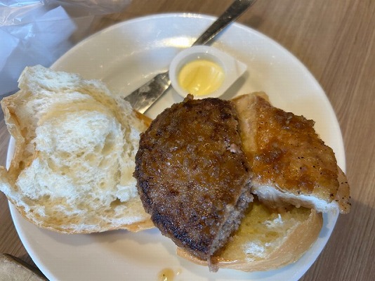 余ってたハンバーグとチキンを挟んでハンバーガーにしました。