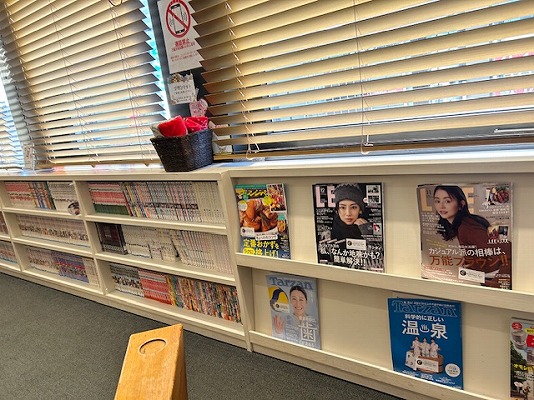 本棚には、たくさんの雑誌やマンガ本がありました。