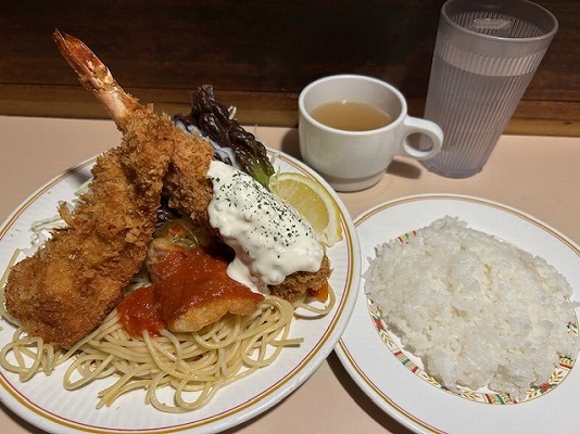コッチは、お皿の上に山盛り千キャベツとスパゲッティが乗り、その上にチキンカツ・白身魚フライ・エビフライがのってます。