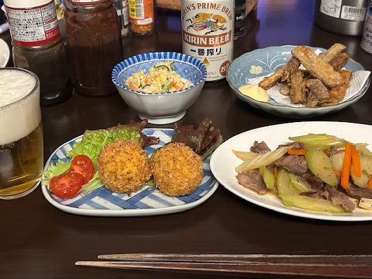 メニューはビールの横から、揚げないコロッケ・砂肝とセロリの中華炒め・ゴボウのから揚げ・ポテサラ