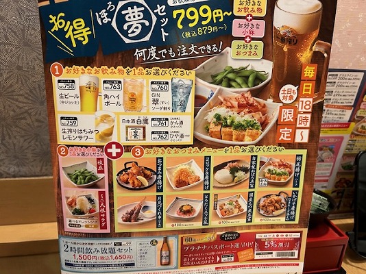 ドリンクに、おつまみが2品付くほろ夢セットってのがお得感を醸し出してます。