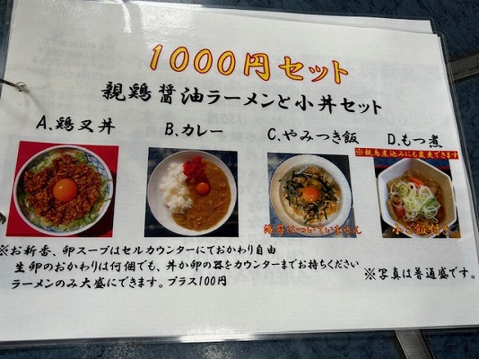 右側の1,000円セットは、親鶏しょうゆラーメンにミニ丼が付いてます。