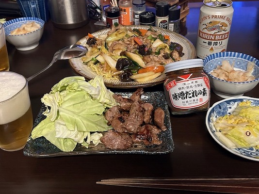 メニューはビールの横から、カシラ焼き・白菜漬け・大根と梅のサラダ・八宝菜