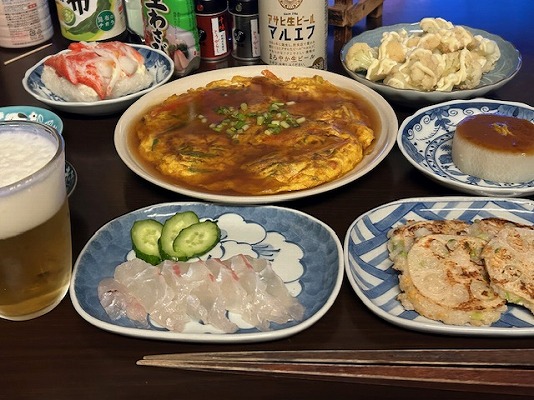 メニューはビールの横から、真鯛の昆布〆・すりおろしレンコン焼き・ふろふき大根・かに玉・かにかまおにぎらず・カリフラワー