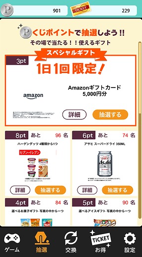 で、ポイントを使うには、抽選のアイコンをタッチ