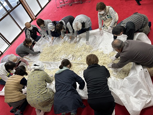 11月2日早朝から、前久保地区では、乗り子と一行にふるまうための焼米を作ります。焼米は、前久保地内の農家から奉納された米と大豆を材料に、忌み事のなかった男性のみによって作られます。