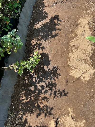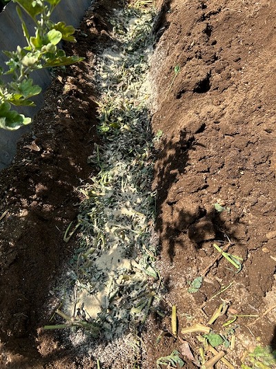 菜園内の端の方に溝を掘って、敷き詰めます。