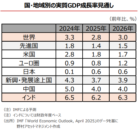 - 力強い経済成長:IMFは2025年のインドの経済成長率見通しを小幅に下方修正したものの、依然として世界経済を上回る高い水準を維持しています。