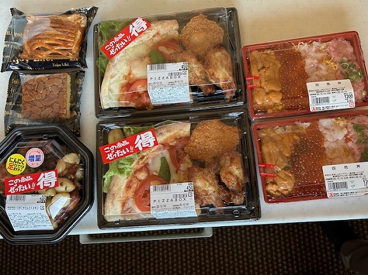 四色丼と、夕食用のPIZZABOXとスタミナニンニクチキンに、3時のおやつのアップルパイとフロランタン