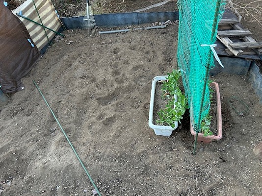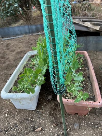 スナップエンドウの蔓を這わせるネットも、ちゃんとしてます。
