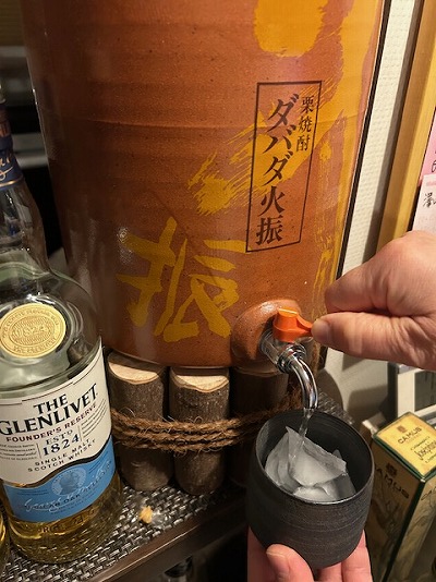器が香酒盃なので、お湯割りの方が香りは立つのですが、ロックの方が味が分かるのでロックにしました。