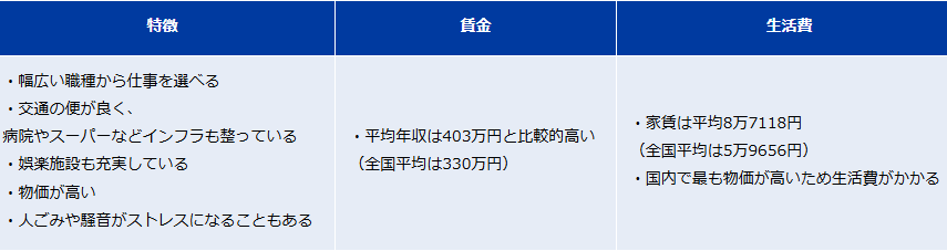 上位3都県の賃金や生活費、地域の特徴を表にまとめてくれてました。