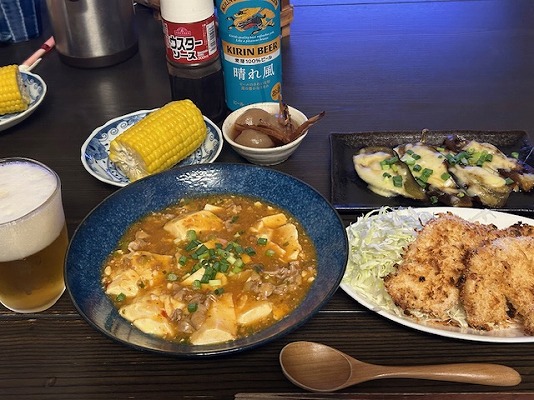 メニューはビールの横から、麻婆豆腐・ささみフライ・ナスのチーズ焼き・玉こんにゃく・トウモロコシ