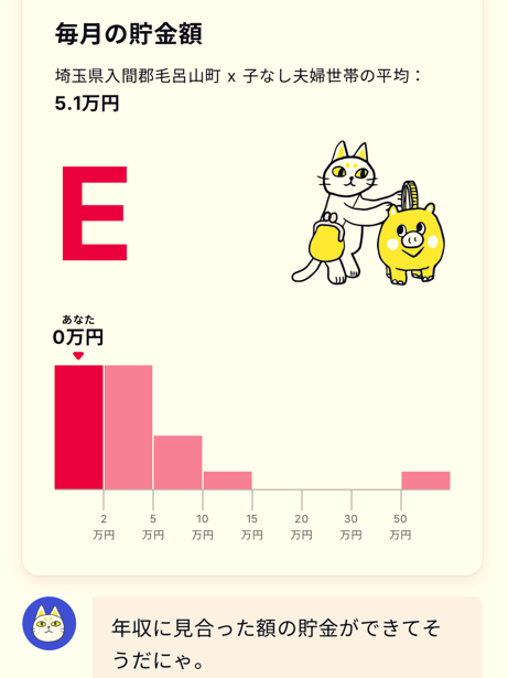 「年収に見合った額の貯金ができそうだにゃ。」なぁ~んてかわいくもないネコちゃんに言われましたが、毎月の収入が無いので、貯金できてないですぅ~