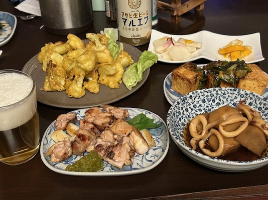 メニューはビールの横から、焼き鳥・イカと里芋煮・厚揚げの葱ソースのせ・ユズのはちみつ漬け・かぶの甘酢漬け・カリフラワーフリッター