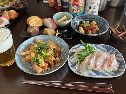 メニューはビールの横から、長芋とベーコンのバター炒め・真鯛の昆布〆・きんぴらごぼう・マグロアボカド・おせち的なもの