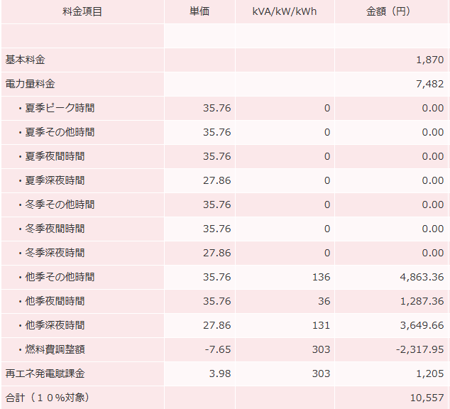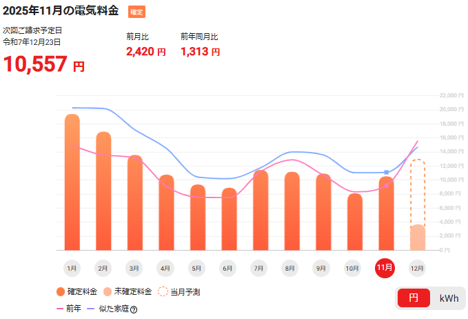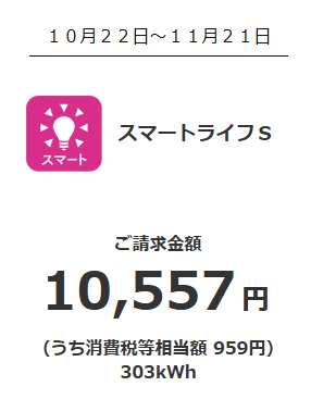 今年の11月分は、31日間で303kwh使って10,557円でした。