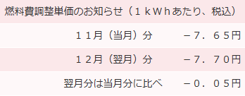 去年の11月燃料費調整額は、1kwhあたり-8.67円で、約-2,315円でした。
