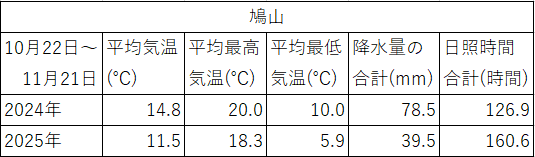 毛呂山町の隣町の鳩山町には、気象庁の観測所がありますので、去年と今年の10月22日~11月21日までの31日間の気温などを表にしてみました。