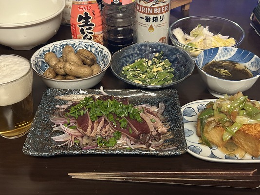 メニューはビールの横から、カツオのたたき・厚揚げの葱あんかけ・もずく酢・大根葉の卵炒め・茹で落花生・白菜サラダ
