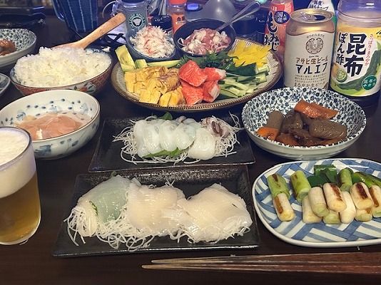 メニューはビールの横から、イカ刺し・焼きねぎ・プリプリごろっときんぴらごぼう・生たこ刺し・手巻き寿司セット