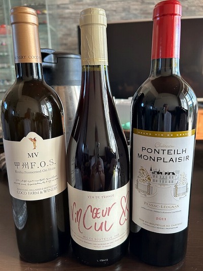 左のが、ココ・ファームのオレンジワインで、隣2つが赤ワイン