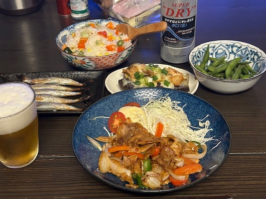 メニューはビールの横から、豚肉のスタミナ焼き・枝豆・ナスキムチチーズ焼き・ししゃも・夏野菜おこわ
