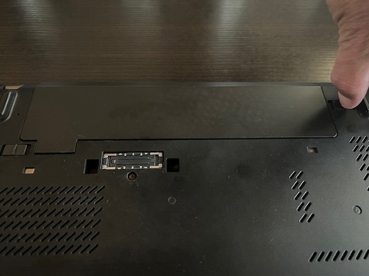 左側のつまみを左に引っ張りながらスケールや精密ドライバーなどを本体とバッテリーの隙間に入れて少しこじってから、右側のつまみを右に引っ張って取り出します。