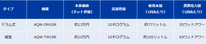 ちなみに、ビートウォッシュBW-V100Mだと、価格は約9万円・容量10kg・水は103L・消費電力量は51whでした。