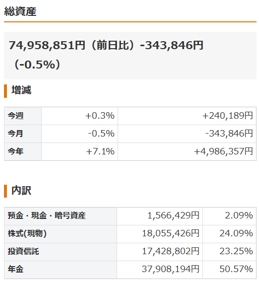 ちなみに、iDeCoを含めた総資産で言うと、先月が約7,246万円で今月が約7,496万円なので、約250万円も上げております。