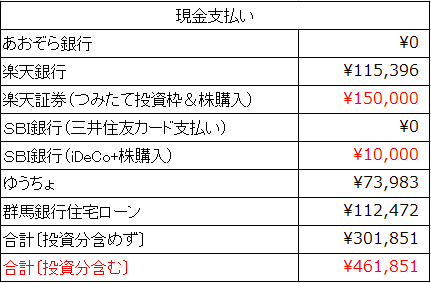 支払いで目立つものは、ほぼほぼ無いですが外食で約4万1千円と、栗焼酎ダバダ火振り購入で約2万円と、サプリ購入で約1万8千円くらいです。