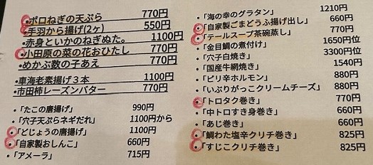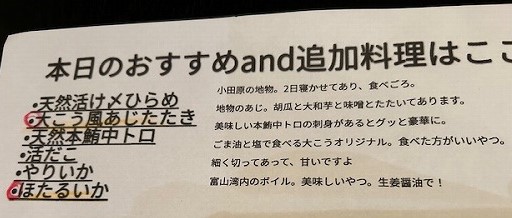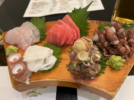 手前右側から時計回りに、大こう風鰺のたたき・活だこ・天然活け〆ひらめ・天然本鮪中トロ・ほたるいか。