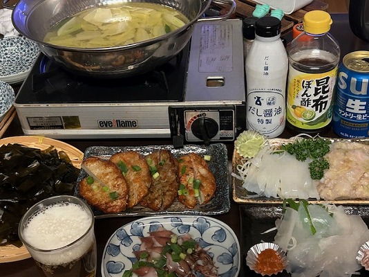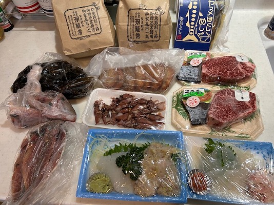 あら~ ラップで分かりにくいですが、右下からカワハギの造り・すみやきのなめろう(ヤリイカのゲソ入り)・ヤリイカ刺し・自家製アジの干物・カワハギの頭(おまけで味噌汁用に付けてくれました)・ホタルイカ・ステーキ用足柄牛(ヒレ)・さつま揚げ・生わかめ・削り節・ヤマメほぐしめしの素