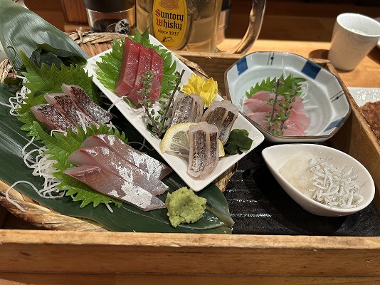 しらすおろしから時計回りに太刀魚・カンパチ・黒むつ・まぐろ・鯛